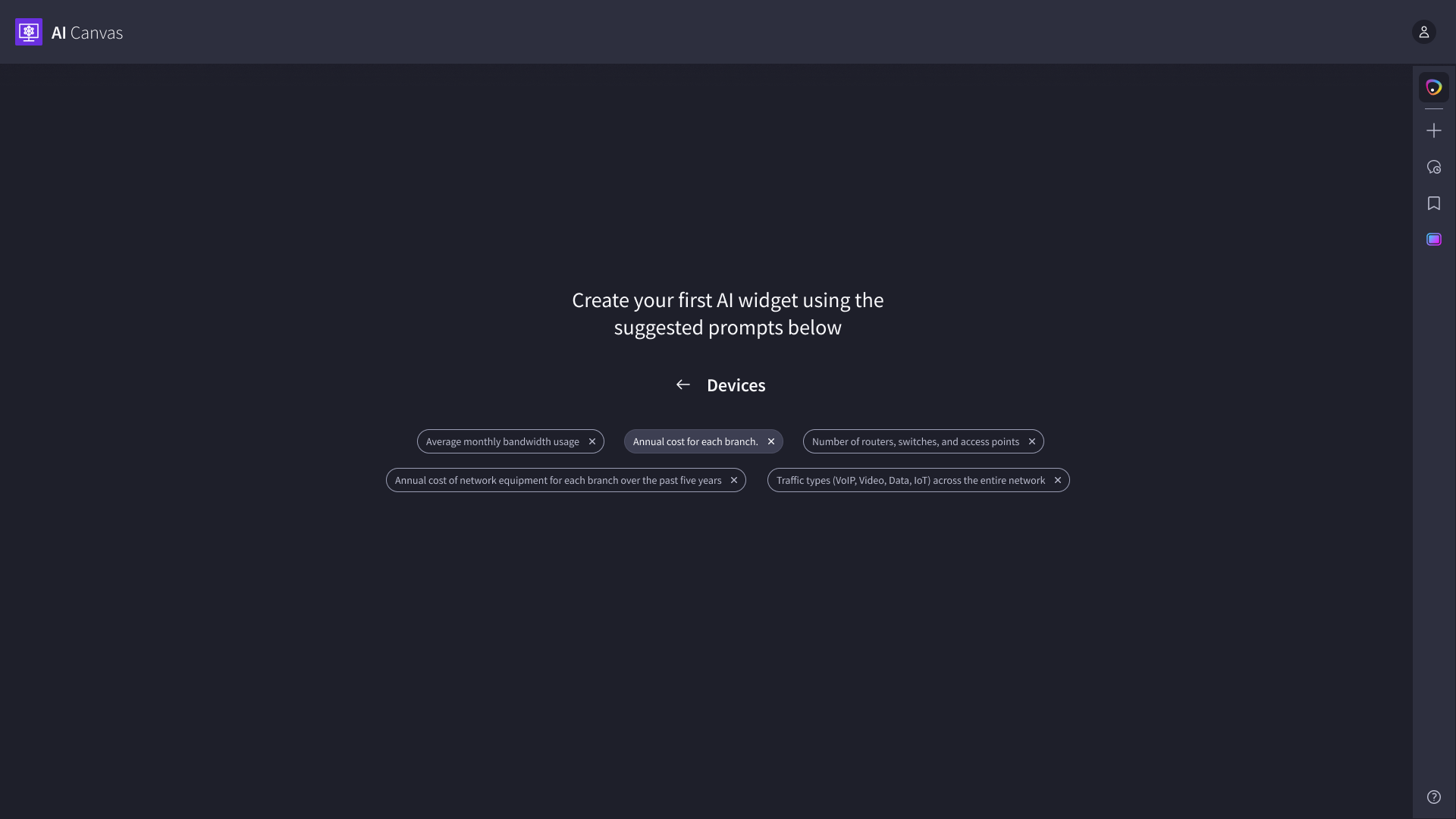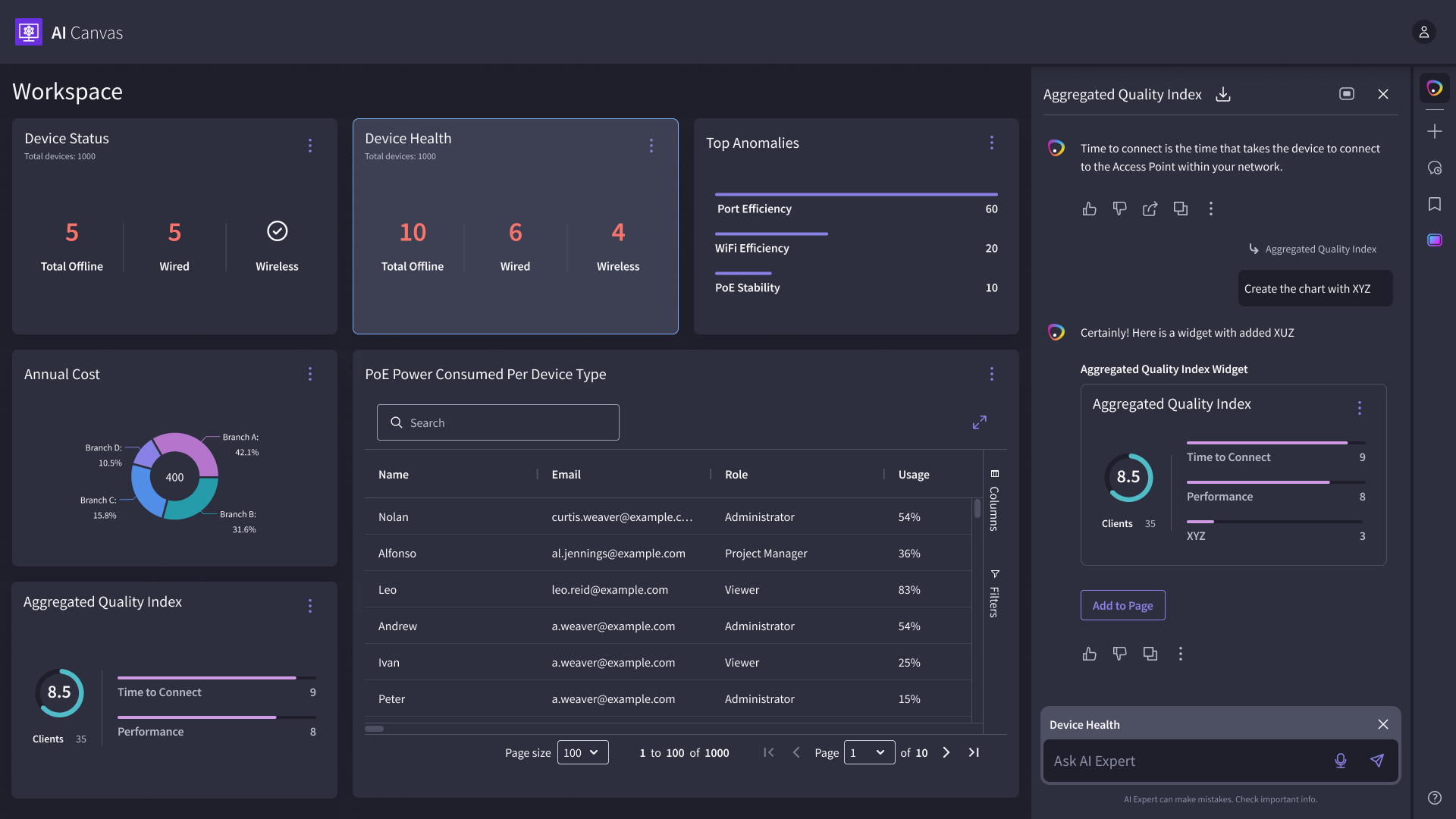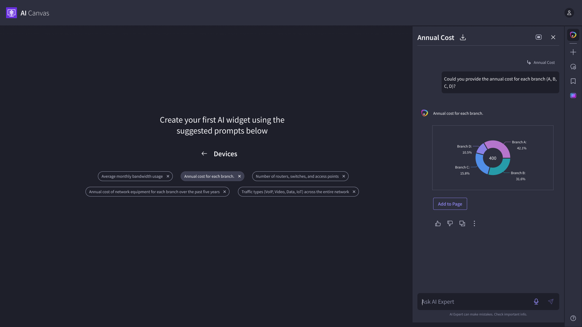 We designed an AI-powered canvas that helps network engineers generate artifacts like charts, graphs, and tables through a chat interface. Beyond artifact creation, we implemented interactions that allow users to talk to widgets, troubleshoot networking issues, monitor events in real time, and act on AI-driven recommendations via integrated notifications (Slack and Email).