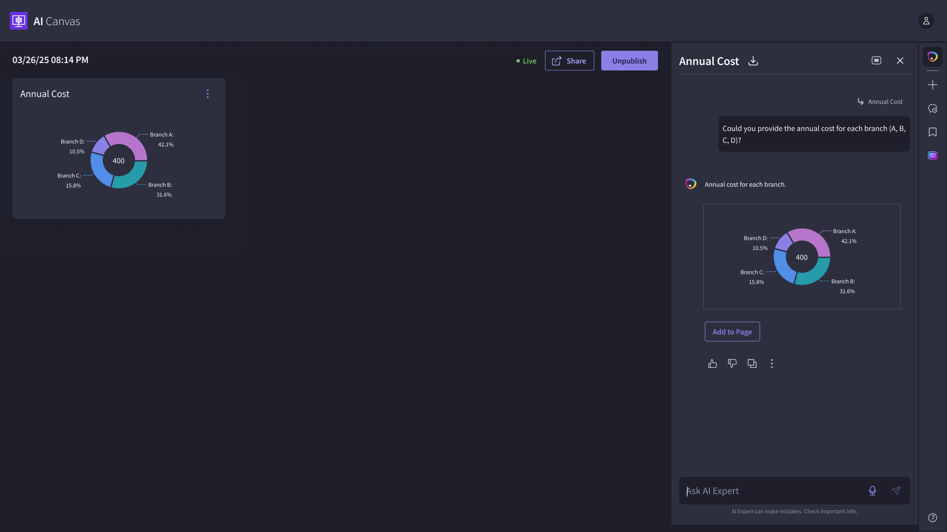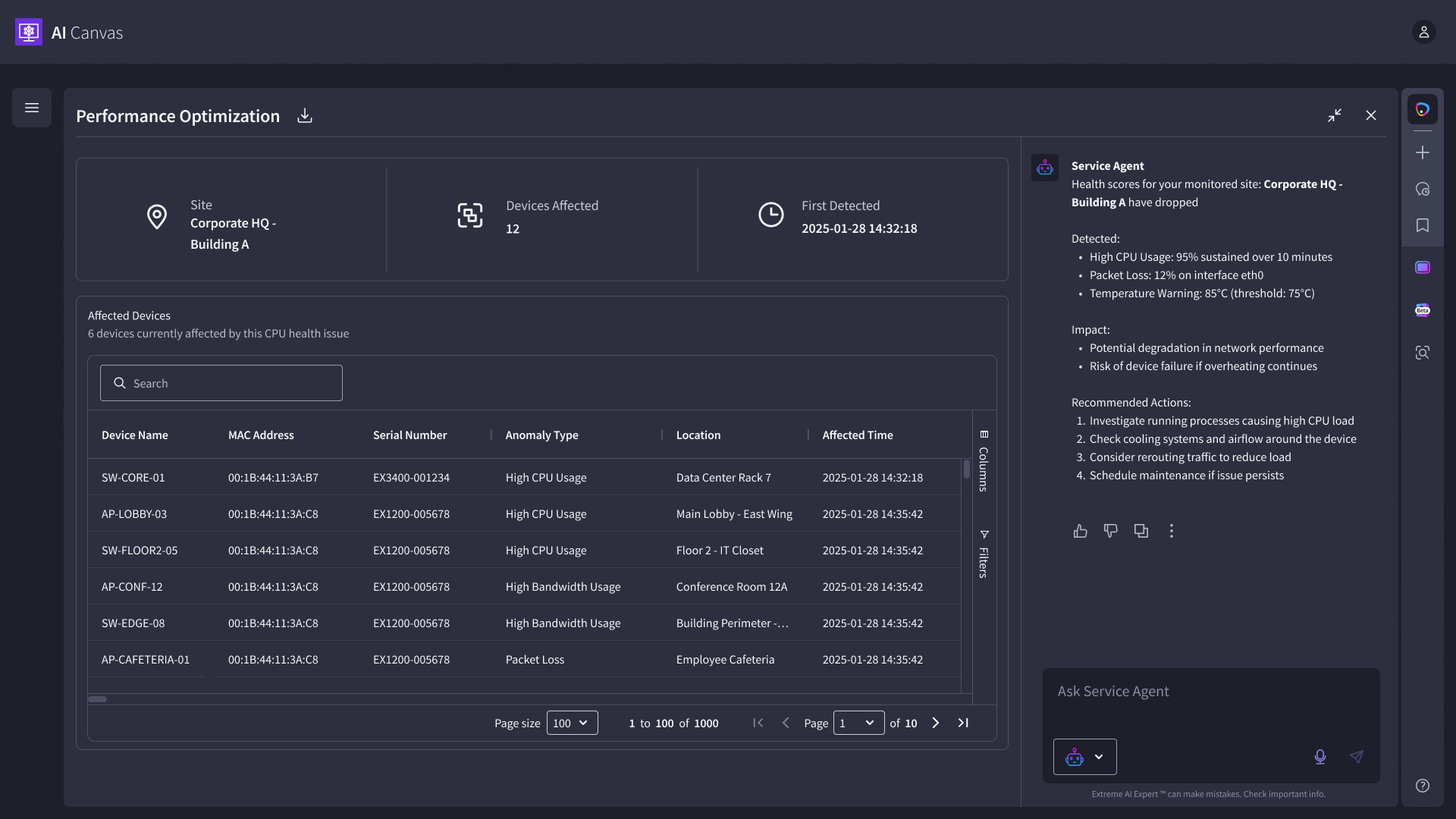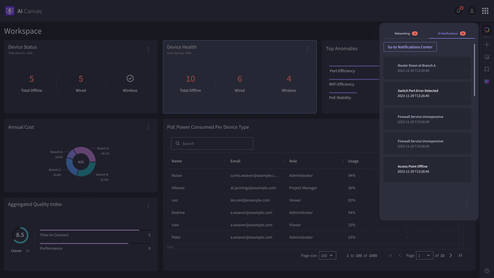 We designed an AI-powered canvas that helps network engineers generate artifacts like charts, graphs, and tables through a chat interface. Beyond artifact creation, we implemented interactions that allow users to talk to widgets, troubleshoot networking issues, monitor events in real time, and act on AI-driven recommendations via integrated notifications (Slack and Email).