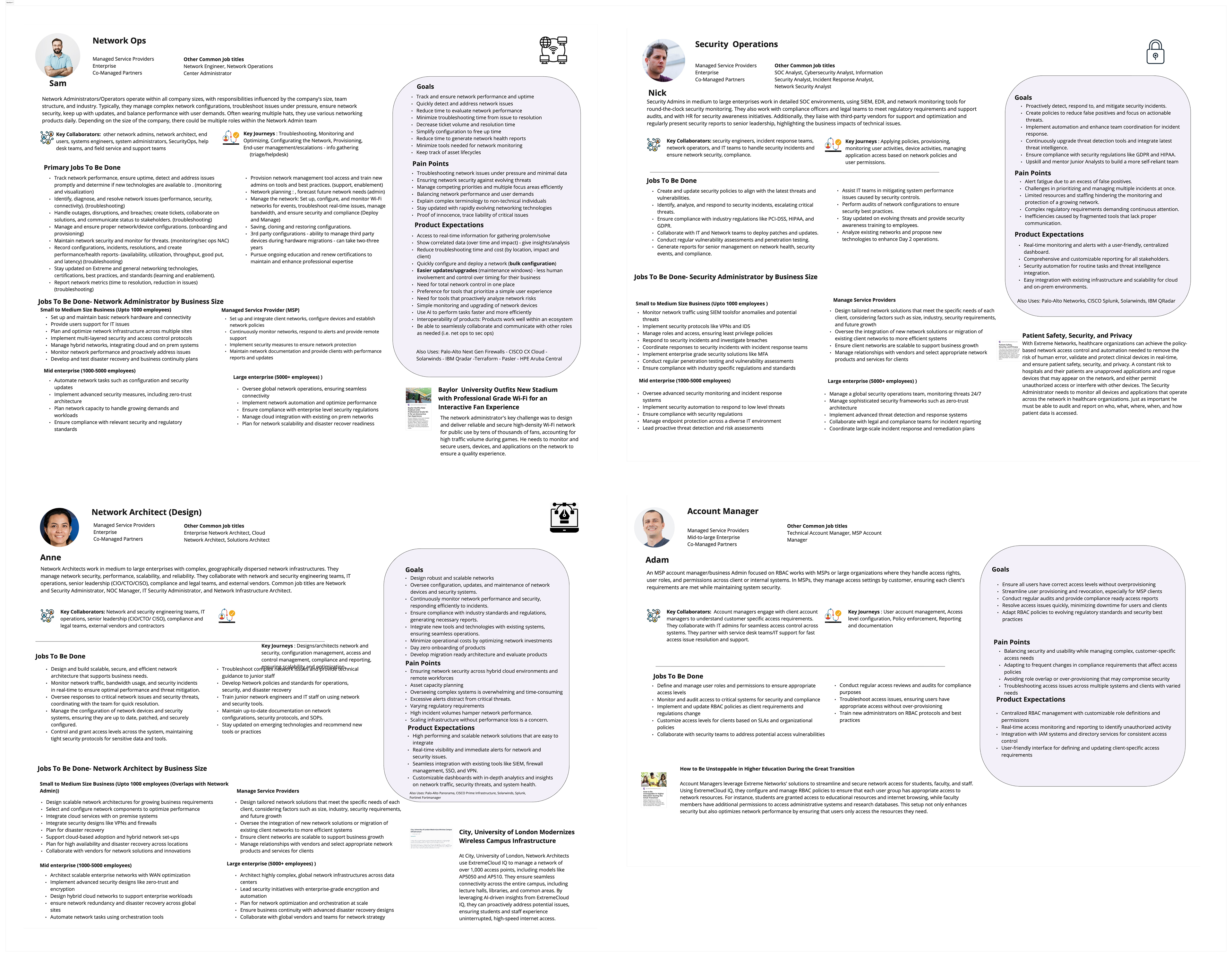 Four personas are defined: Networks Ops, Security Ops, Network Architect, Accountt Manager representing user types.