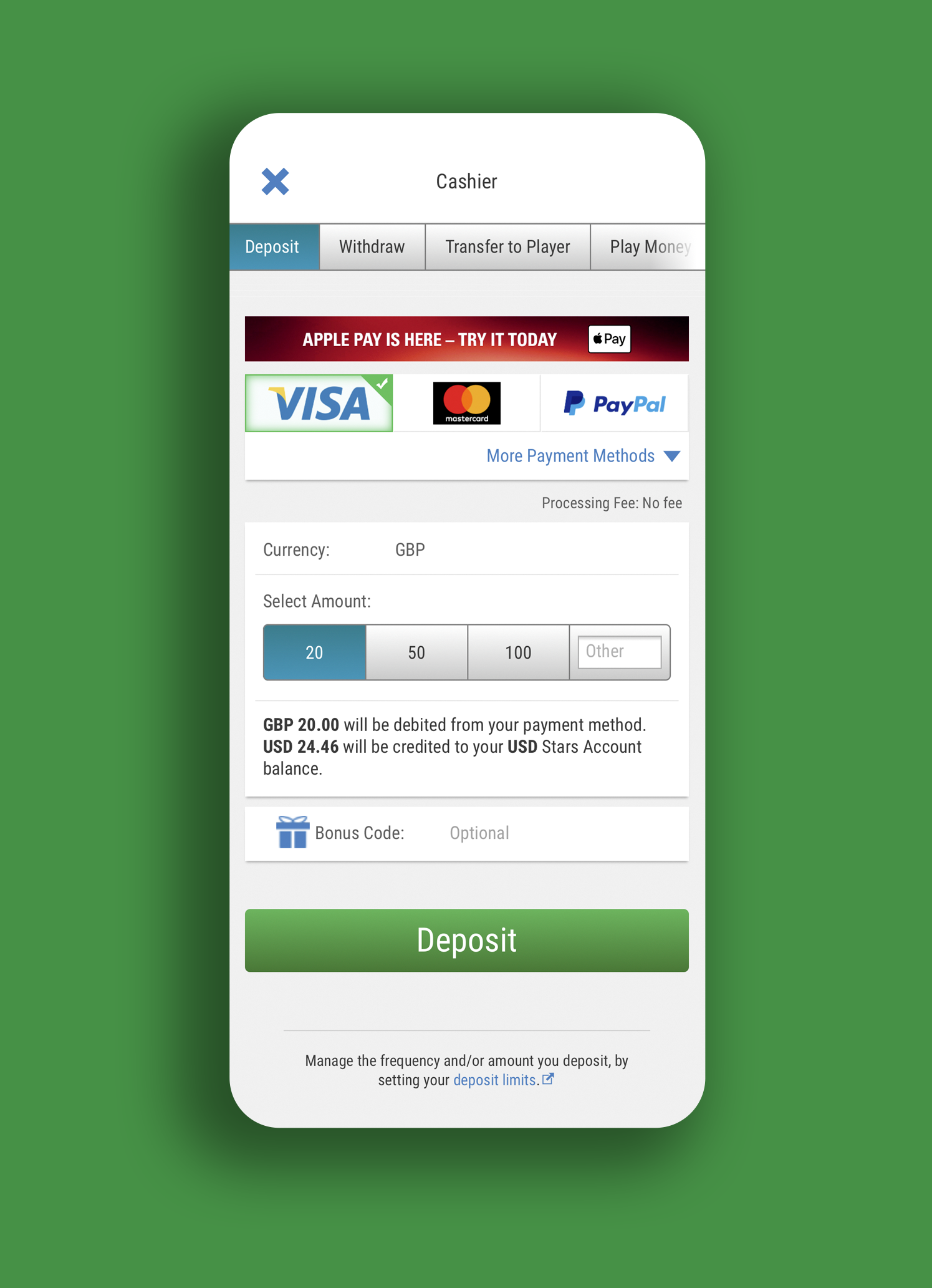 Home → Games → Tournaments → Promotions → Account.